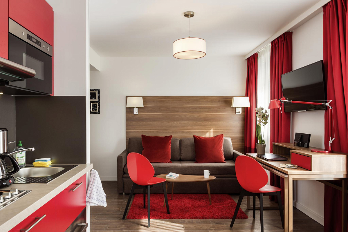Для комфортного размещения гостей мы предлагаем 149 уютных номеров квартирного типа, оснащенных небольшой кухней со всем необходимым оборудованием для приготовления быстрого перекуса или грандиозного ужина, кроватями с большими и легкими подушками, мягкими одеялами и современными матрасами. Также к Вашему удобству каждый номер оборудован: небольшим рабочим пространством, центральной системой вентилирования, телевизором, сейфом, гардеробом, ванной комнатой и полностью оснащенной кухонной зоной. Кухня в номере оснащена: плитой, холодильником, чайником, кофе-машиной, микроволновой печью с функцией духовки, посудомоечной машиной и посудой. Также, в комплектацию номера входят: гель для душа, шампунь и мыло в универсальных дозаторах, гигиенические принадлежности (зубной, бритвенный и косметический наборы, шапочка для душа, расческа), также в номерах есть комплект полотенец, гладильные принадлежности, тапочки и халаты для каждого гостя.